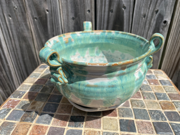 Beautiful white and green hanging planter with drain holes and attached drip tray. Just attach your favorite rope or chain! 6"x7"