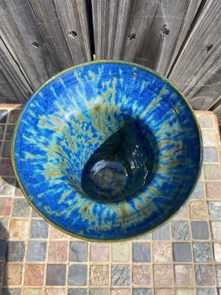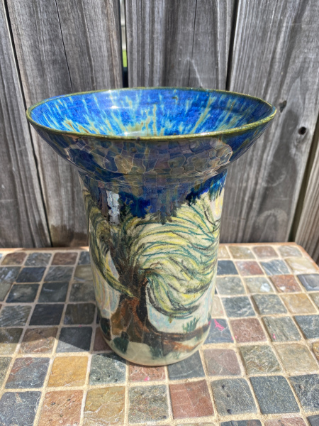 7"x6" one of a kind vase with hand drawn tree and beautiful blue glossy glaze.
